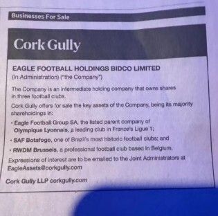 A SAF do Botafogo foi posta à venda no jornal Financial Times. A publicação foi feita pela Cork Gully, nova administradora da Eagle Football.