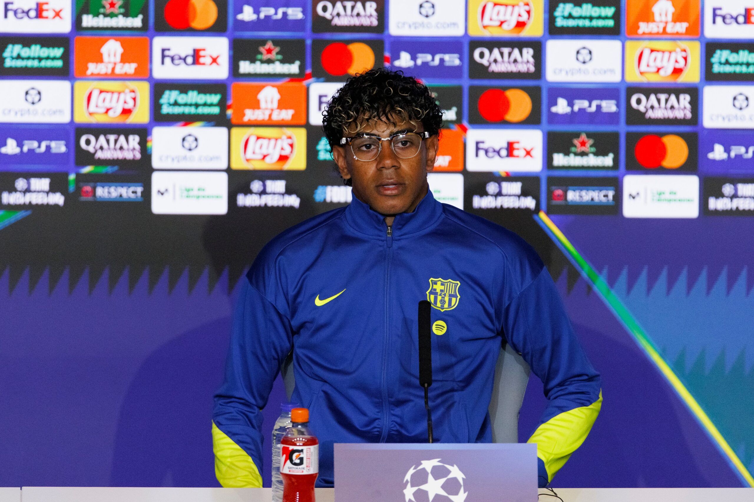 Lamine Yamal em entrevista coletiva antes de Atlético de Madrid x Barcelona pela Champions League (Guillermo Martinez/NurPhoto/Shutterstock)