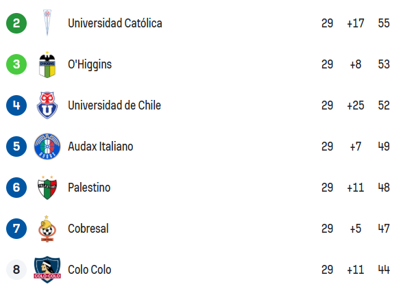 Mientras algunos definen el cupo a Copa Libertadores, como el 'triangular' entre la UC, O’Higgins y la U, cuyo perdedor irá directo a la Sudamericana, la verdadera batalla está en el último cupo. Audax Italiano y Palestino ya tienen su lugar asegurado en el torneo que la 'U' ganó de forma mítica en 2011 con Sampaoli, pero falta definir quién se queda con esa última plaza.