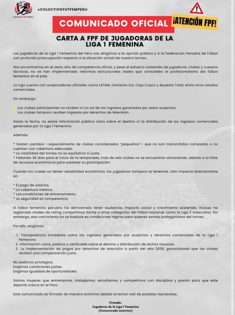 El documento ha sido difundido de manera anónima y no cuenta con firmas individuales que lo respalden, debido —según se indica— al temor de posibles represalias. Sin embargo, el mensaje representa una llamada de atención a la Federación Peruana de Fútbol y vuelve a poner sobre la mesa el debate sobre la profesionalización y sostenibilidad del fútbol femenino en el Perú.