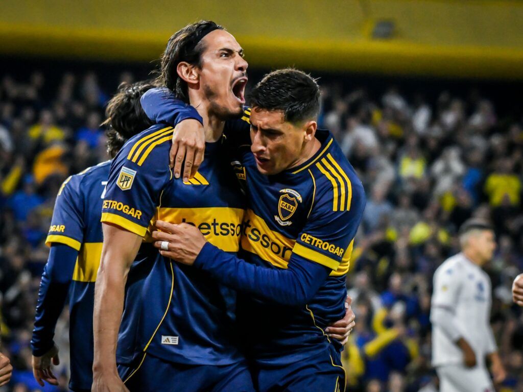 En Buenos Aires, Argentina, el 17 de noviembre de 2025, Edinson Cavani (izq.) y Miguel Ángel Merentiel (der.) celebran el gol de Cavani en el partido entre Boca Juniors y Club Atlético Tigre. Boca Juniors venció a Tigre por 2-0 en la fecha 15 de la Liga Profesional de Fútbol, en el estadio Alberto J. Armando, La Bombonera. Boca Juniors vs Tigre – Torneo Apertura Betano 2025, Buenos Aires, Argentina – 16 de noviembre de 2025.
